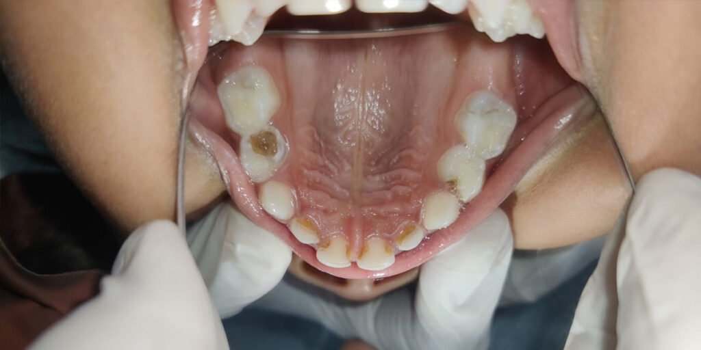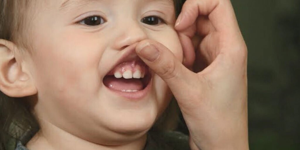 Gently lift your child’s upper lip once in a while to check for: